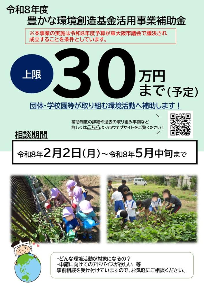 市民や事業者の皆さんからの寄附、募金、ふるさと東大阪応援寄附金(ふるさと納税)等を積み立てる東大阪市豊かな環境創造基金を活用して、環境教育の振興、環境啓発、改善活動を行う団体等へ活動費用を補助します。