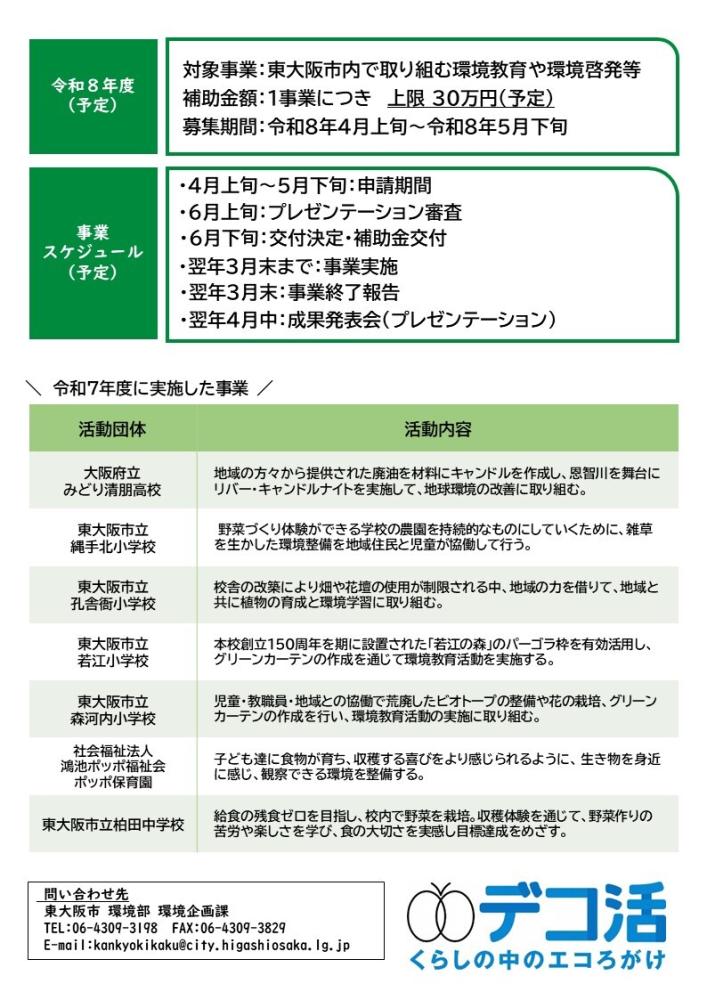 | 1 | 環境に関する教育及び学習の振興を目的とし、学校園等が直接又は保護者や地域住民等と協働で実施する独創性のある単年度または継続的な事業 |
