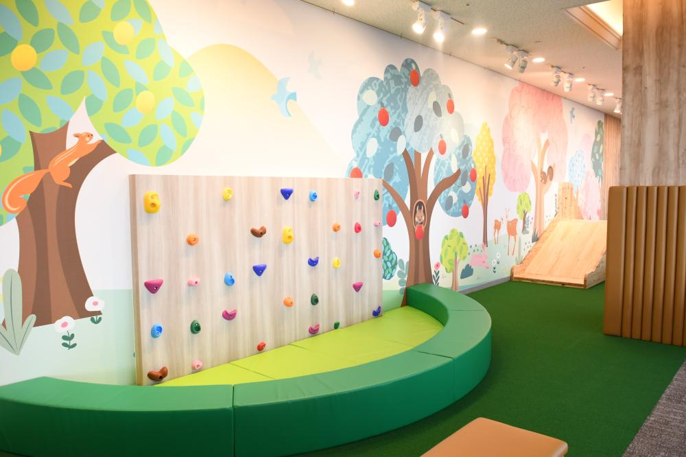 小さなお子様がのびのびと身体を動かすことができる、芝生広場です。天候を気にせず、ボルダリングやすべり台を楽しめるほか、保護者の方もベンチに座ってお子様を見守ることができます。
