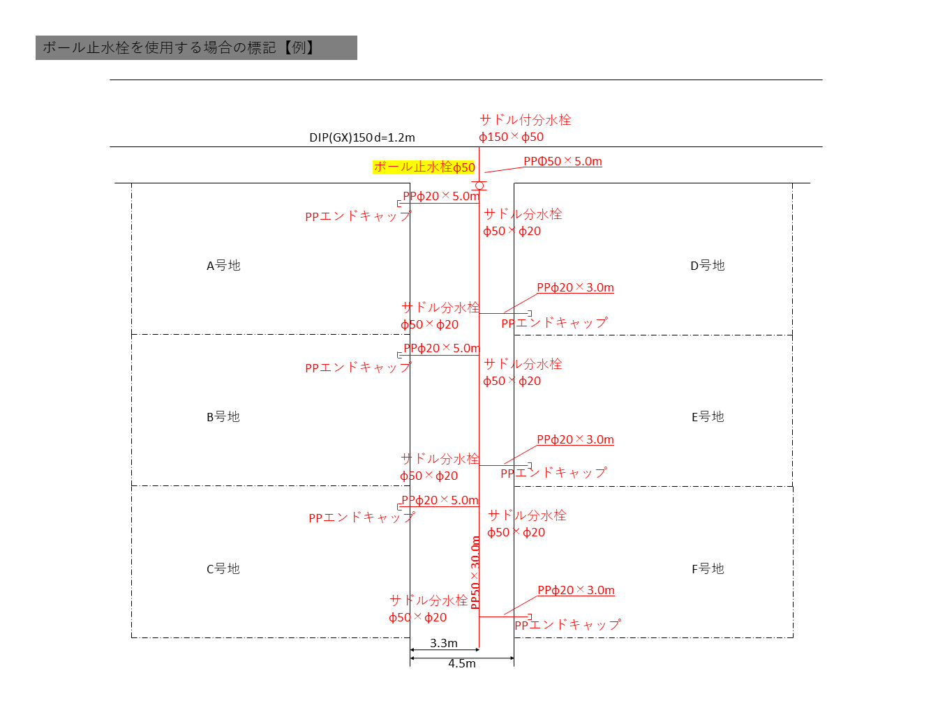 従来の甲型止水栓と区別できるように、以下の例のとおり図面表記をお願いいたします。