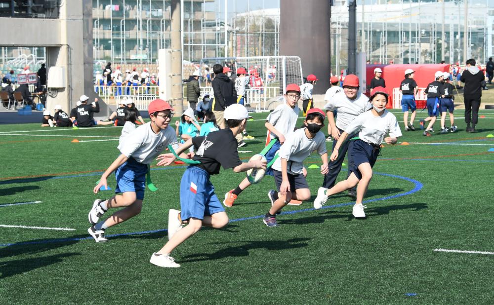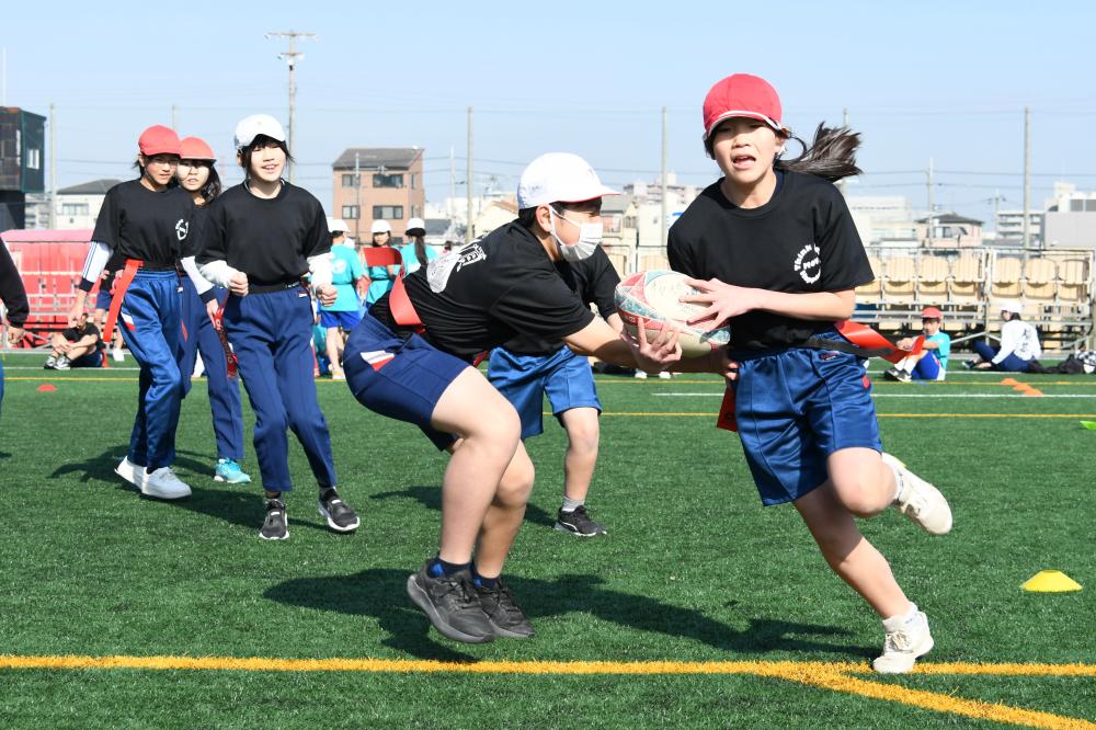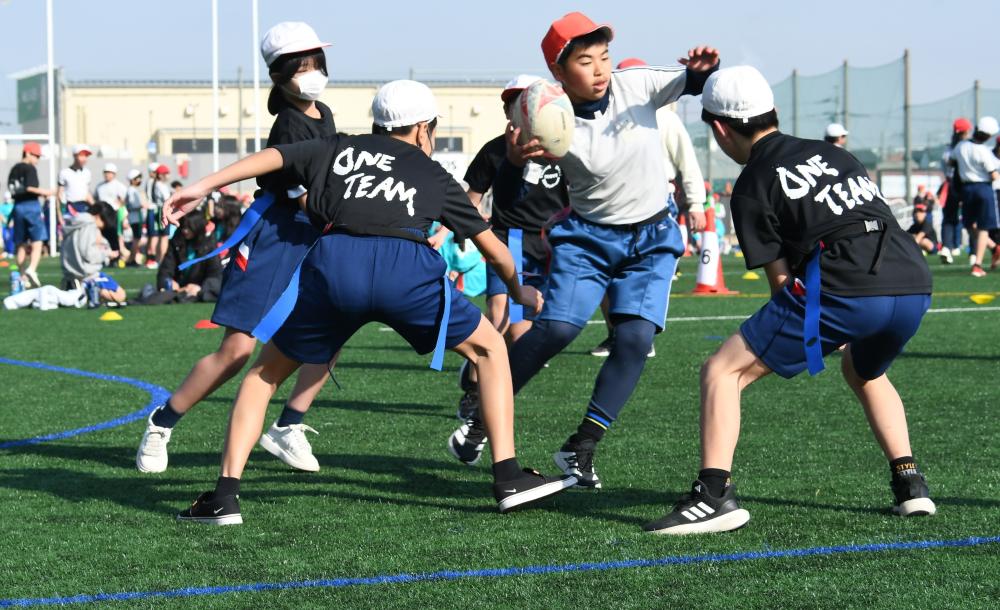 従来のラグビーで行われるタックルなどの身体接触を一切排除した、誰でも安全に楽しむことができるボールゲームで、平成20年から「小学校学習指導要領解説体育編」に例示されています。東大阪市では平成23年度から取り組んでいます。