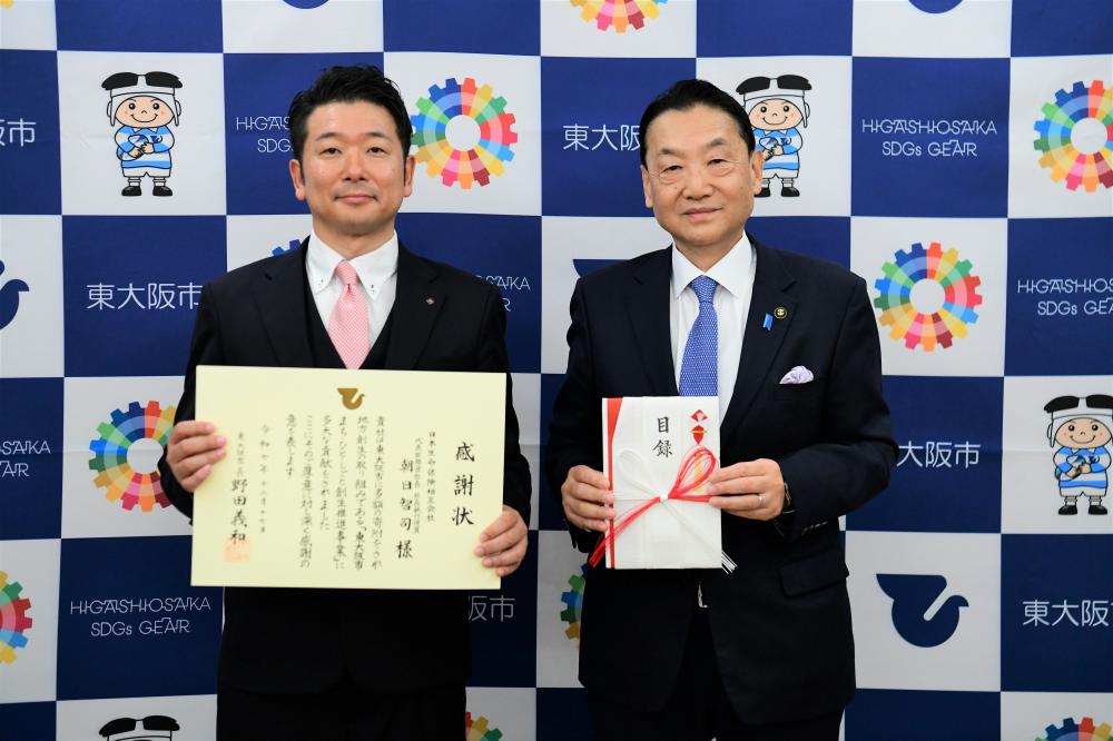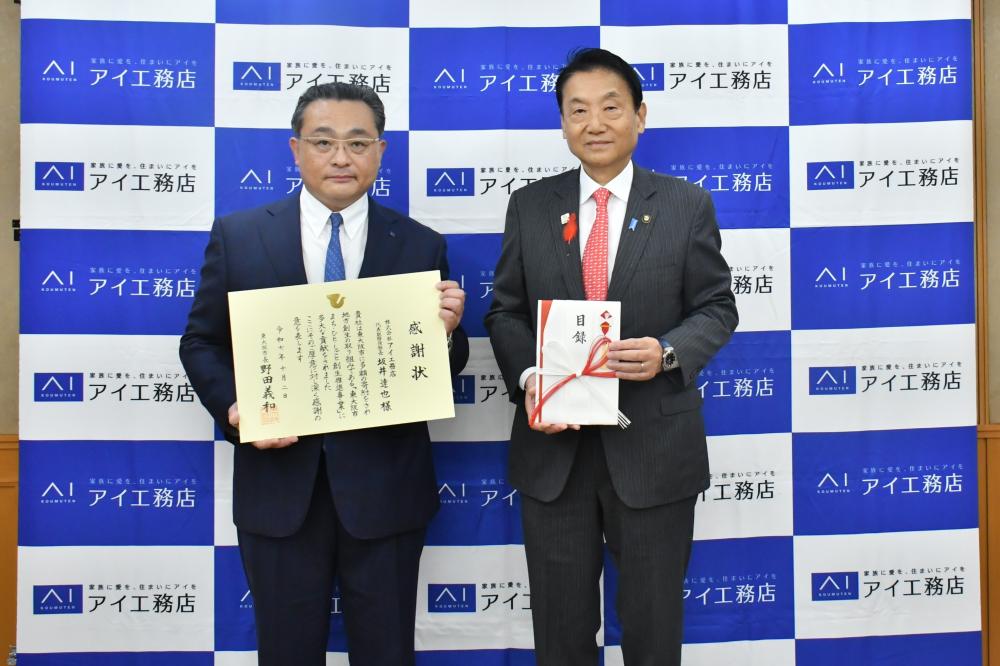 ご寄附に対する感謝の意を込め、令和7年10月2日に株式会社アイ工務店様に対して感謝状の贈呈を行いました。