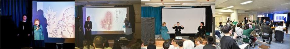 安藤美紀さんのみきまる座舞台「桃と桜」が上演されました。本作は、生まれつき耳が聞こえない娘と、彼女を支える健常者の母親の姿を描いた物語です。「障害の有無に関わらず、誰もが共に楽しめる舞台を」という想いのもと、舞台上では文字や手話、そして歌を織り交ぜた独自の表現が展開されました。その熱気あふれる演出に、会場に集まった子どもたちや市民の皆さんは熱心に見入り、時には深く頷きながら物語の世界に引き込まれていました。障害を受け入れ、手を取り合って生きていくことの大切さを改めて気づく貴重なひとときとなりました。ご来場いただいた皆様、誠にありがとうございました。