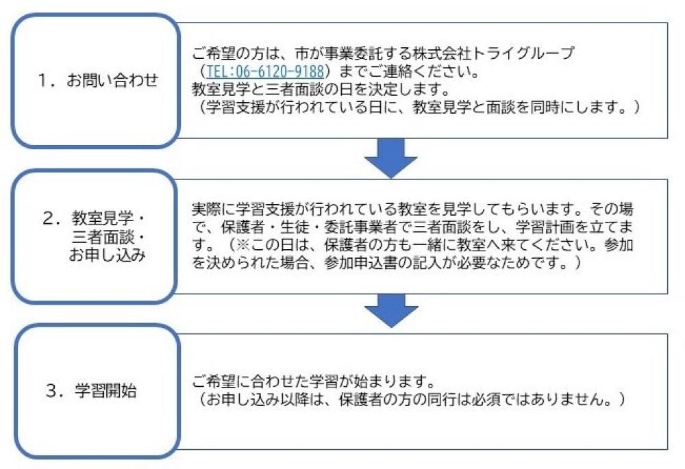 ご希望の方は、市が事業委託する株式会社トライグループにお電話いただき、「東大阪市の中学生・高校生への学習支援について」とお伝えください。