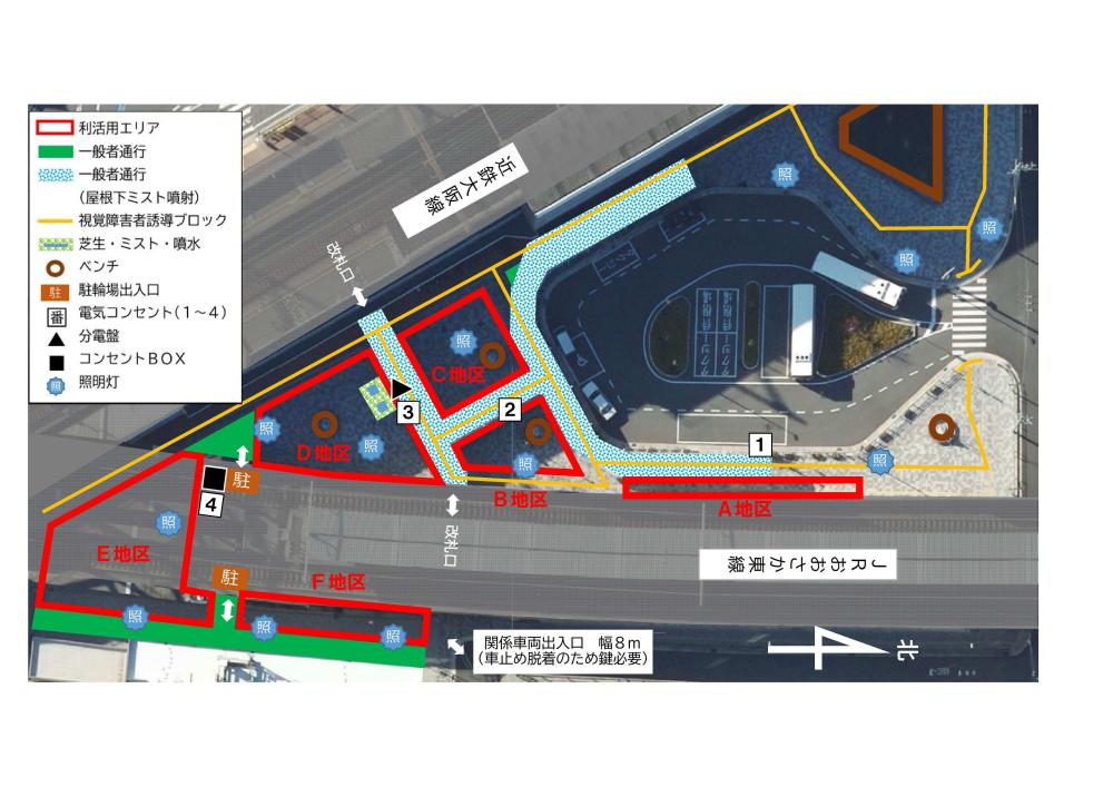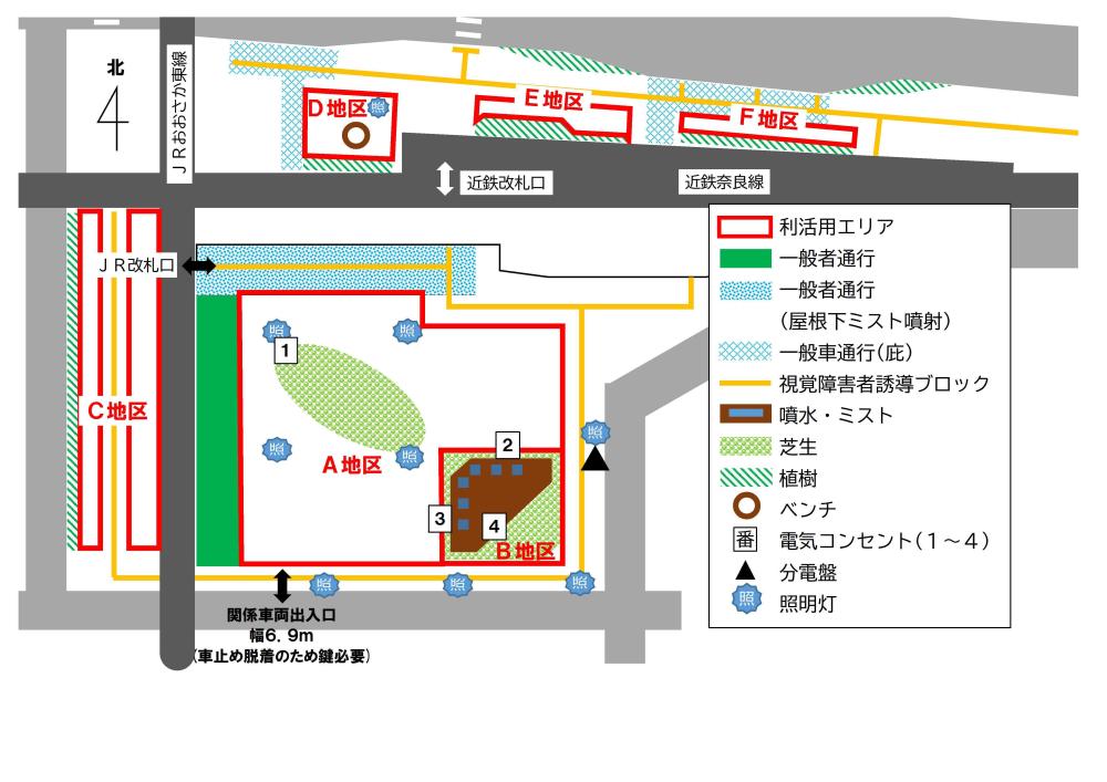 :上記エリアに加え、瓢箪山駅前せせらぎ広場も電気コンセントをご利用できます。