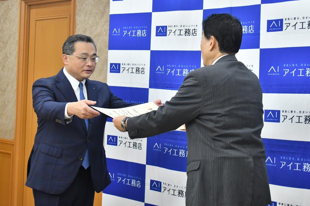 令和7年10月2日 子育て世帯を応援 (株)アイ工務店へ感謝状を贈呈