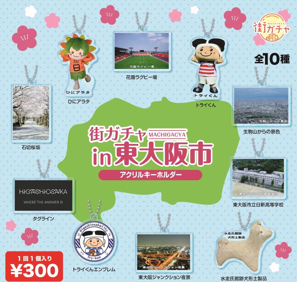 東大阪市内の名所やトライくんなどをデザインしたオリジナルキーホルダーをカプセル玩具販売機で「街ガチャ」として販売します。